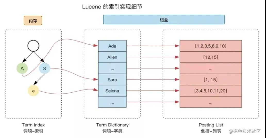 lucene 使用 “term index→term dictionary→postings list” 的倒排索引结构,通过 FST 压缩放入内存,进一步提高搜索效率。