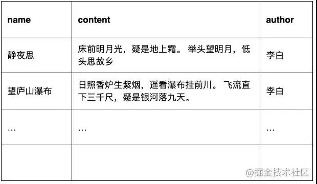 用传统关系型数据库和 ES 实现会有什么差别?如果用像 MySQL 这样的 RDBMS 来存储古诗的话,我们应该会去使用这样的 SQL 去查询: