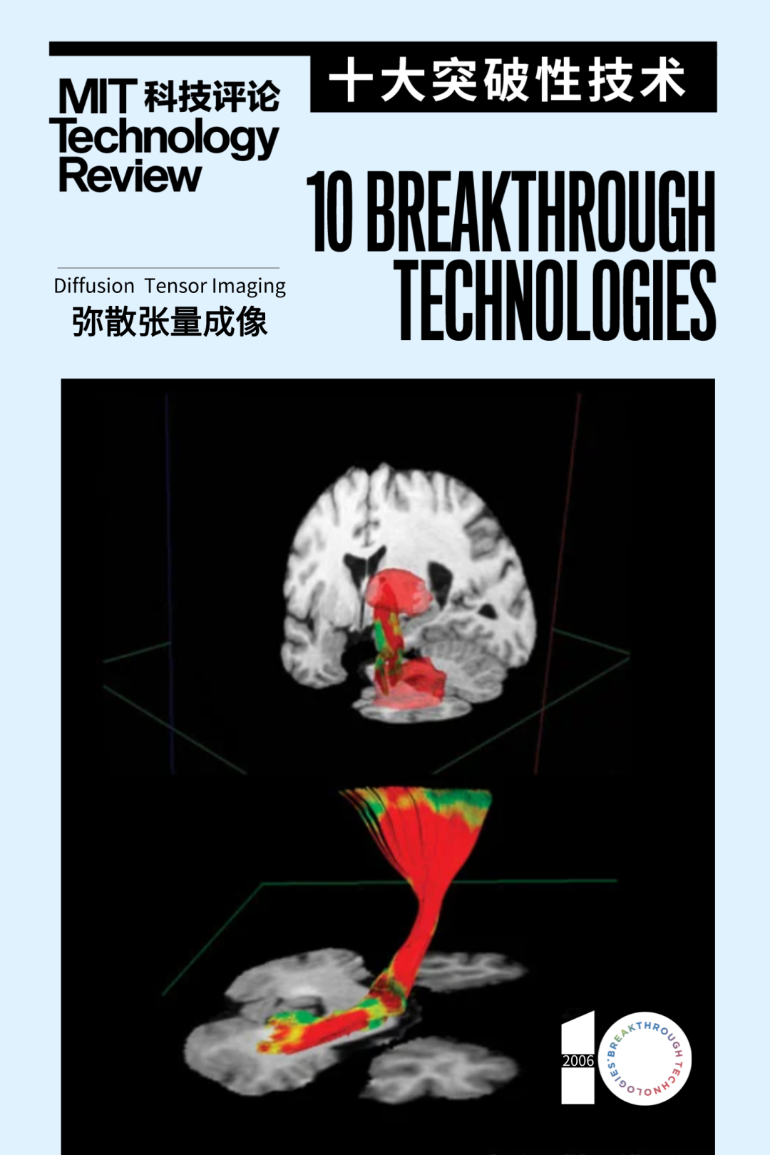 2006年入选“全球十大突破性技术”的“弥散张量成像”(DTI) 技术通过追踪大脑中水分子扩散的方向来绘制其中轴突的分布和走向,让我们得以一窥大脑中神经元之间传输电信号的脑白质的真容,这一大脑成像技术的重大进展加深了我们对大脑运作方式的认知。