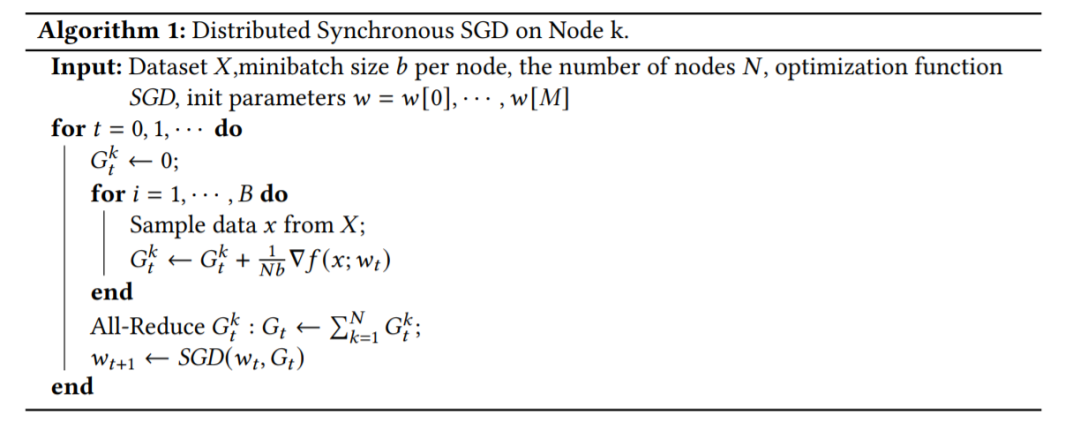 大规模分布式训练提高了训练更深、更大模型的效率,其中采用了数据并行,充分利用了多个workers的计算能力。SGD计算效率高,并且得到了DL工具包TensorFlow[1]、PyTorch[77]和DeepSpeed[83]的良好支持,因此通常被选择为优化方法。在数据并行的SGD中,每个worker处理其训练数据的随机小批,然后通过一个All-Reduce步骤或通过一个集中的参数服务器来同步本地更新,该服务器聚集了来自所有worker的随机梯度,并采取Broadcast步骤,将更新后的参数向量传送回所有workers。重复梯度同步的过程,直到满足适当的收敛准则。
