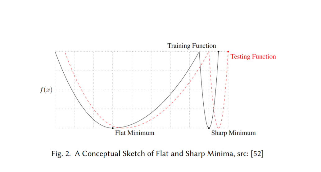 优化通常是一项极其困难的任务,尤其是在训练神经网络时。对于非凸高维函数,有可能存在许多局部极小点和鞍点。优化方法,如SGD,一般收敛于参数空间的不同区域,高度依赖于网络架构的设计、优化器的选择、变量初始化等多种考虑[92]。泛化这个术语指的是一个假设如何很好地适用于训练集中没有看到的新例子。如4.1节所述,我们可以看到,尽管训练函数的值相似,但用大批量方法训练的模型在测试数据上的表现要比小批量方法差[45,52,70,92]。这种泛化性能的持续下降被称为泛化差距。弄清这一差距的根源并找到消除这一差距的方法具有重大的现实意义,但仍是一个悬而未决的问题。本节的结构如下。第5.1节介绍了sharp and flat (wide) minima的概念;5.2节讨论了局部最小值的锐度/平整度与其泛化能力之间的关系;第5.3节解释了所谓的泛化差距,第5.4节提供了一个有点相反的解释。