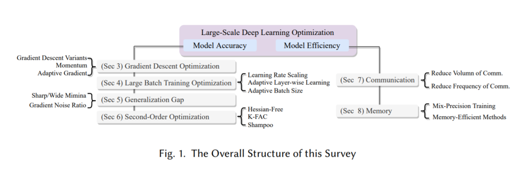 该综述的总体结构如图1所示。第2节介绍了一个典型的有监督学习神经网络优化问题的公式。我们将大规模DL优化大致分为模型精度和模型效率两部分。第3节介绍了梯度下降优化系列,包括梯度下降变种、动量SGD和自适应梯度算法。随着具有数据并行性的大批训练在DL中日益普及,同时也带来了挑战,第4节讨论了在这一设置中存在的问题,并回顾了主要的SOTA优化策略来改善这种情况。第5部分深入探讨了泛化差距——批量训练中的一个辩论话题。第6节介绍了二阶优化。然后我们将注意力转向模型效率。第7节调研了通信瓶颈,第8节重点讨论了高效存储技术。最后,第9节对本文进行总结。
