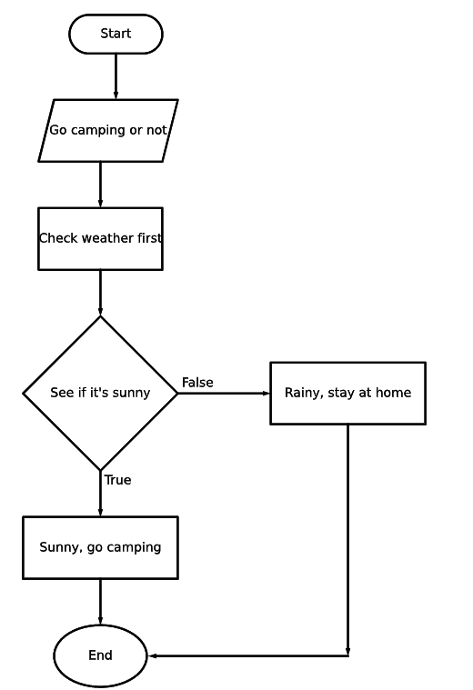 我们来绘制一个简单的流程图,假如周末的时候我们想着要不要出去露营(Camping),那既然要去露营的话,我们肯定是需要查看一下天气,看一下是否是晴天(Sunny),如果是下雨天(Rainy)的话,就不去,按照这种逻辑,我们来绘制一下流程图,代码如下import schemdraw
