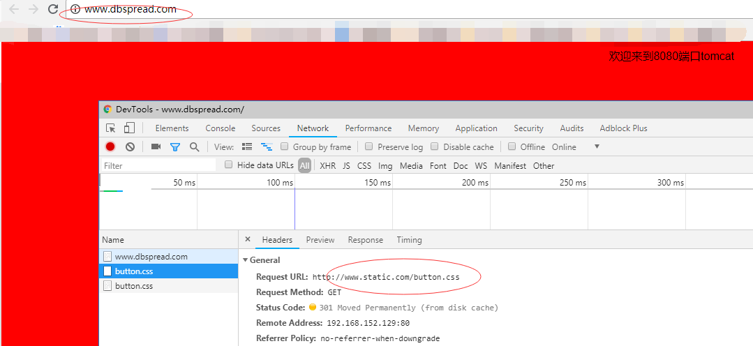4. Nginx动静分离步骤 4.1 准备一个静态资源button.cssbody { margin: 10px 20px; text-align: center; font-family: Arial, sans-serif; background-color: red; } 4.2 在/var/local下新建一个static文件夹用来存放静态资源button.cssimg 4.3 在tomcat-8080/webapps/ROOT下的index.html里面引入button.css "stylesheet" type ="text/css" href="http://www.static.com/button.css" /> "utf-8"> "X-UA-Compatible" content="IE=edge,chrome=1" > "renderer" content="webkit" > "viewport" content="width=device-width, initial-scale=1, maximum-scale=1, user-scalable=no" > test 欢迎来到8080端口tomcat 4.4 在nginx的nginx.conf中server节点新增静态资源分离的配置