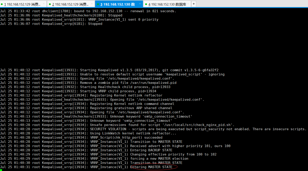 img 5.9 下面我们停掉主节点192.168.152.130的keepalived和nginximg 可以看到从节点变为主节点了