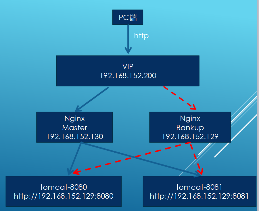 5.7 分别启动192.168.152.129的两个tomcat 5.8 分别启动192.168.152.130(keepalived主节点)和 192.168.152.129(keepalived从节点)的keepalived的启动命令:/usr/local/keepalived/sbin/keepalived