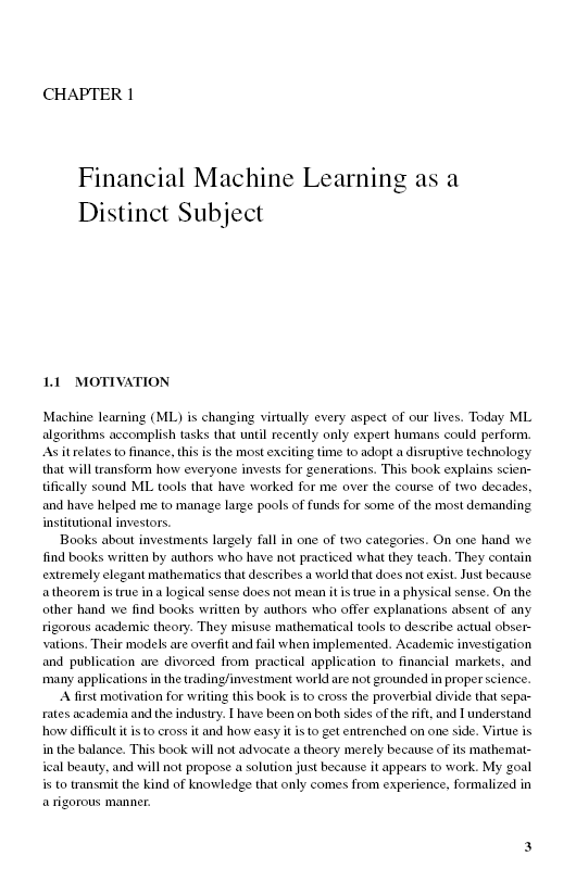 机器学习(ML)实际上正在改变我们生活的方方面面。今天,ML算法完成的任务直到最近还只有专家才能完成。在金融领域,现在是采用一种颠覆性技术的最激动人心的时刻,这种技术将改变世世代代每个人的投资方式。读者将学习如何以符合ML算法的方式构造大数据;如何用ML算法对该数据进行研究;如何使用超级计算方法;如何对你的发现进行反向测试,同时避免误报。这本书解决了实践者每天面临的现实生活问题,并解释了使用数学的科学合理的解决方案,由代码和例子支持。读者成为活跃的用户,他们可以在自己的特定环境中测试所提出的解决方案。本书由公认的专家和投资组合经理撰写,将为投资专业人士提供在现代金融领域取得成功所需的开创性工具。