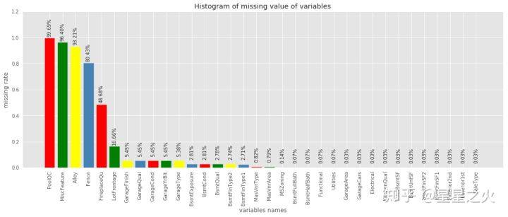 import matplotlib.pyplot as plt import pylab as pl fig = plt.figure(figsize=(18,6)) plt.bar(np.arange(miss_analy.shape[0]), list(miss_analy.missRate.values), align = 'center',color=['red','green','yellow','steelblue']) plt.title('Histogram of missing value of variables') plt.xlabel('variables names') plt.ylabel('missing rate') # 添加x轴标签,并旋转90度 plt.xticks(np.arange(miss_analy.shape[0]),list(miss_analy['index'])) pl.xticks(rotation=90) # 添加数值显示 for x,y in enumerate(list(miss_analy.missRate.values)): plt.text(x,y+0.12,'{:.2%}'.format(y),ha='center',rotation=90) plt.ylim([0,1.2]) plt.show() 这样的统计计算以及可视化基本已经看出哪些变量缺失,以及缺失比例情况,对数据即有个缺失概况。下面将对缺失变量进行相应处理。