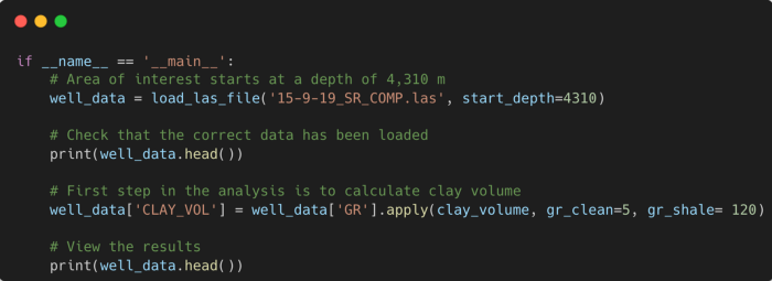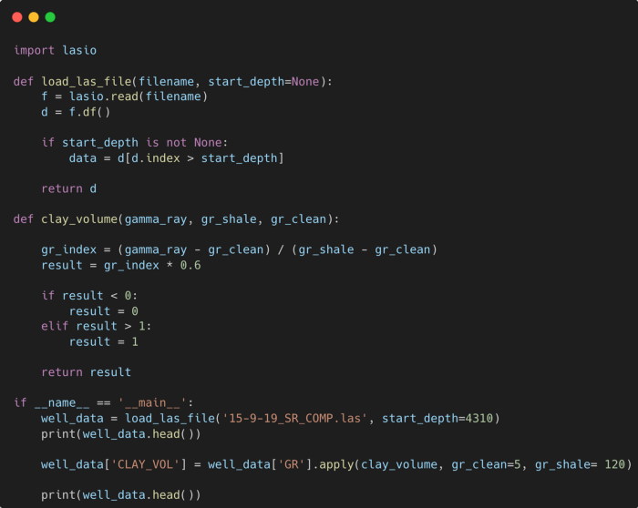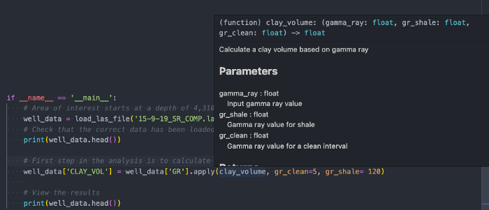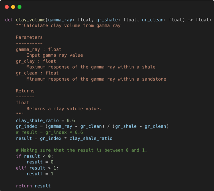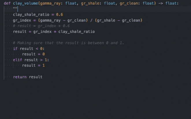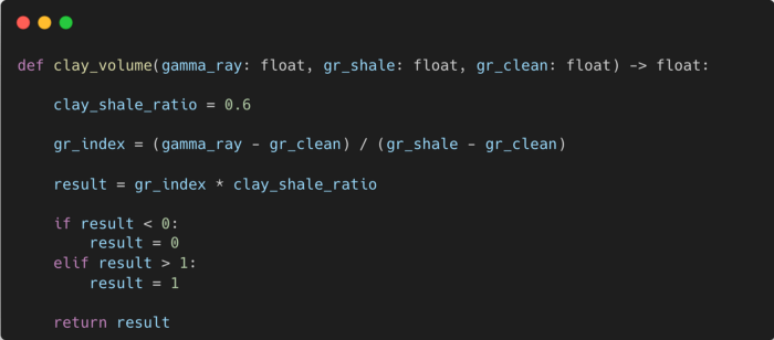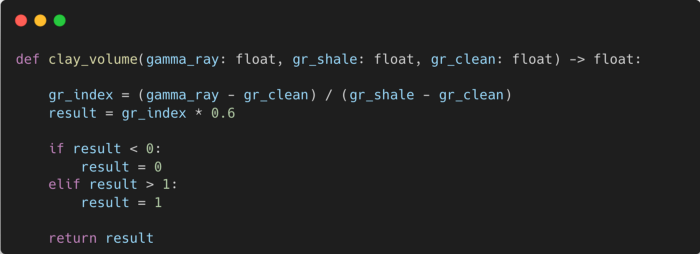 如果我们声明一个变量并将该值分配给它,那么我们就有更好的机会知道它是什么。在这种情况下,它是用于将伽马射线指数转换为粘土体积的粘土与页岩的比率。