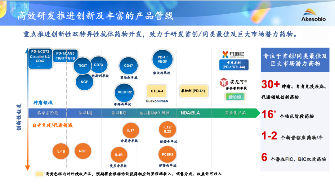 其中,肿瘤领域有2大核心双抗处于关键/III期临床研究阶段,包括PD-1/VEGF-A双抗药物依沃西单抗和IL-12p40单抗药物依若奇单抗。自免/代谢领域,也有2款新药(AK102、AK101)相继完成III期临床入组。
