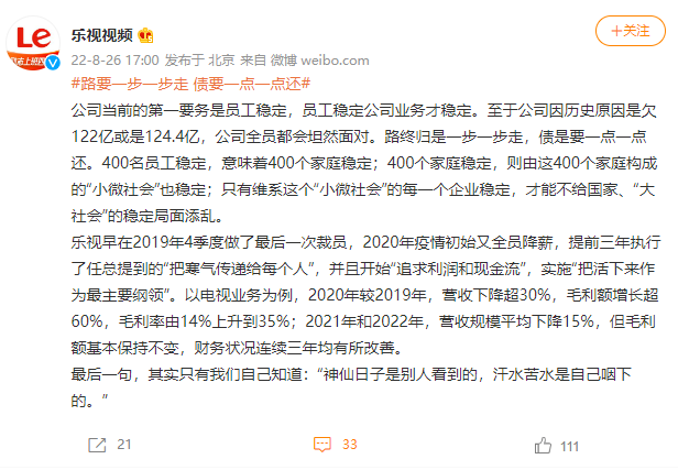 北京法院审判信息网 8 月 25 日公布证监会与乐视网行政非诉执行执行裁定书。裁定书显示,2021 年 3 月 26 日,证监会作出案涉行政处罚决定,对乐视网处以 24060 万元罚款。乐视网至今仍未缴纳罚款。2022 年 5 月 19 日,北京金融法院作出裁定:准予强制执行对乐视网 24060 万元罚款的行政处罚。乐视官方微博发文回应称,公司当前第一要务是员工稳定,员工稳定公司业务才稳定。至于公司因历史原因是欠 122 亿或是 124.4 亿,公司全员都会坦然面对。路终归是一步一步走,债是要一点一点还。
