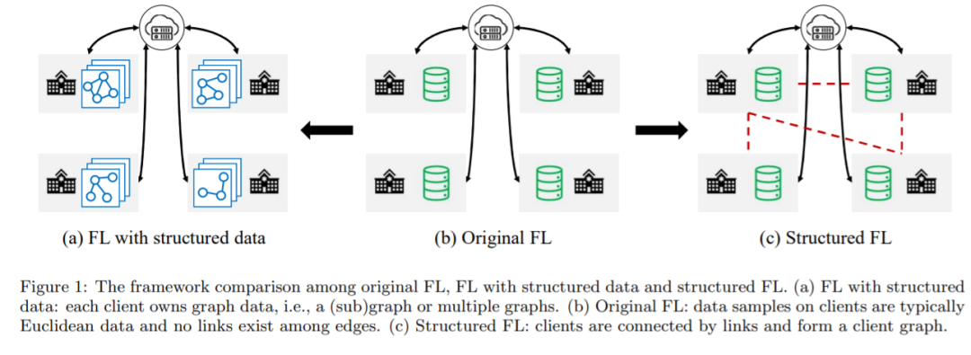 第一种是具有结构化数据的 FL,在具有结构化数据的 FL 中,客户基于其图数据协作训练图机器学习模型,同时将图数据保留在本地。