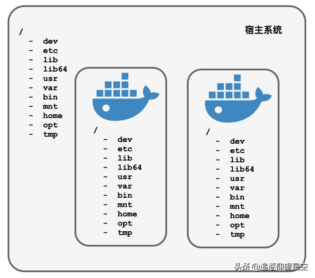 为了不露出破绽,Docker很聪明,用操作系统镜像文件挂载到容器进程的根目录下,变成容器的rootfs,和真实系统目录一模一样,足可以以假乱真: