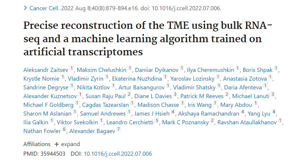 Aleksandr Zaitsev, Maksim Chelushkin, Daniiar Dyikanov. et al. Precise reconstruction of the TME using bulk RNA-seq and a machine learning algorithm trained on artificial transcriptomes. Cancer cell (2022). DOI:https://doi.org/10.1016/j.ccell.2022.07.006