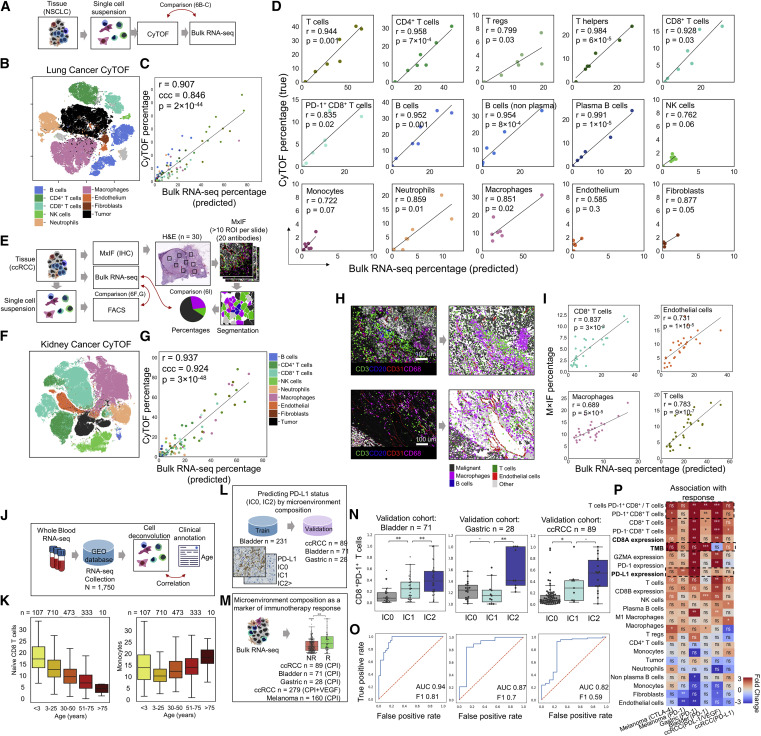 进一步,研究团队在临床环境中收集了不同级别的原发性早期非小细胞肺癌(NSCLC)和透明细胞肾细胞癌(ccRCC)肿瘤,测试了Kassandra准确重建TME的能力。研究团队对NSCLC、ccRCC肿瘤标本进行批量RNA-seq和CyTOF分析,并使用40多种细胞标记对为CyTOF制备的相同细胞悬液进行RNA-seq。(图5)