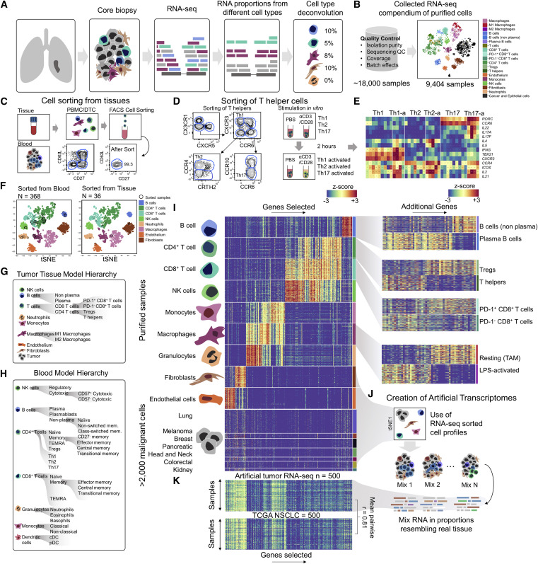 通过收集全面纯化细胞群的RNA,研究团队重建了类似组织和血液的批量RNA图谱,并通过人为地混合来自不同纯化细胞亚群的RNA来模仿组织的异质性,以创建数百万个人工肿瘤转录组,用于训练Kassandra。(图1J)