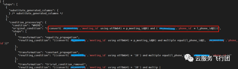 trace显示两个SQL在优化器分析时,将meeting_id做了隐式转换,转换函数为convert('meeting_id' using utf8mb4),也就是将meeting_id做了字符集的转换,熟悉索引机制的同学都清楚,这种情况下优化器是不会走meeting_id索引的。这也可以解释了客户第一次创建索引的时候为啥有性能提升,但效果并不明显,原因就是只有update语句真正用到了索引带来的性能提升,而且是phone_id索引带来的提升,不是性能更高的主键meeting_id。