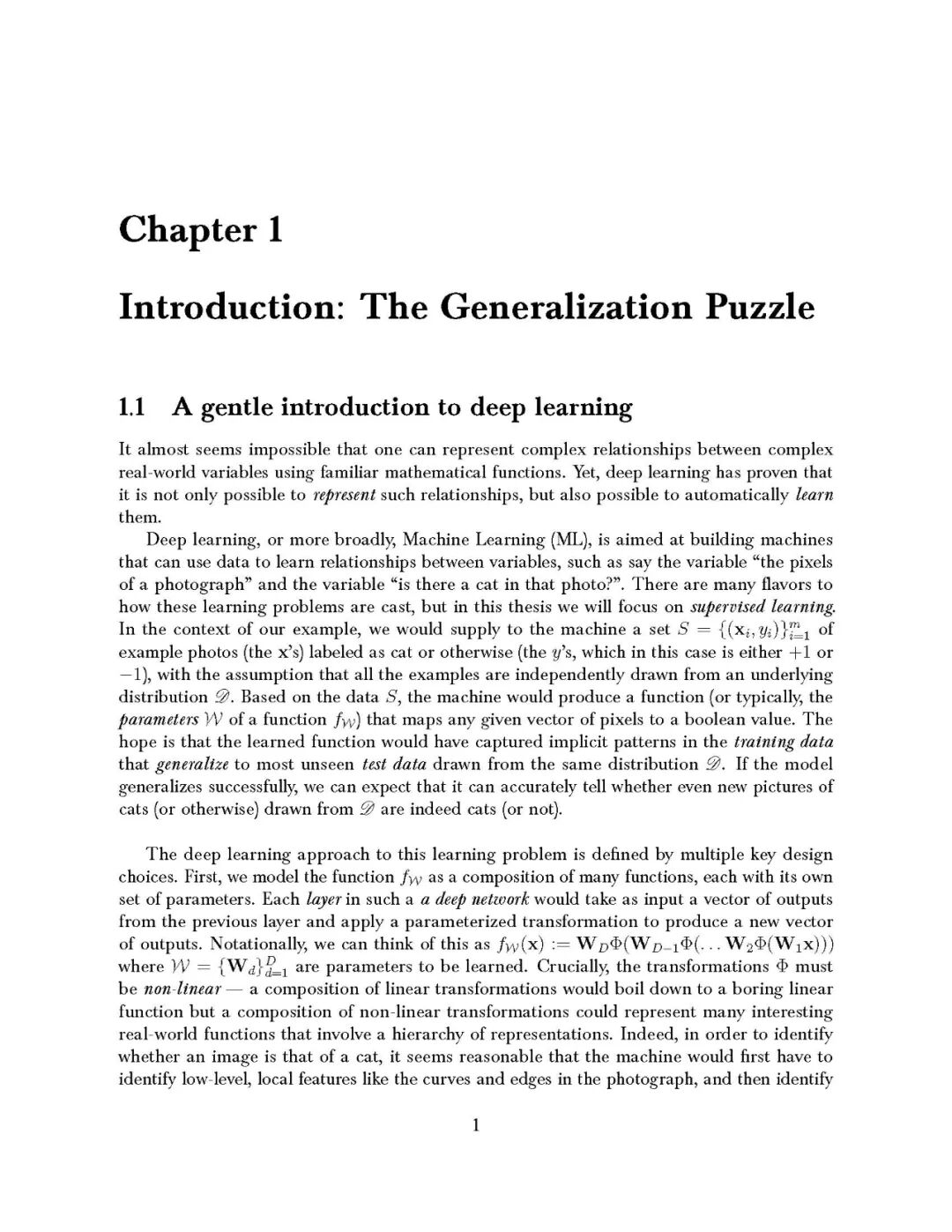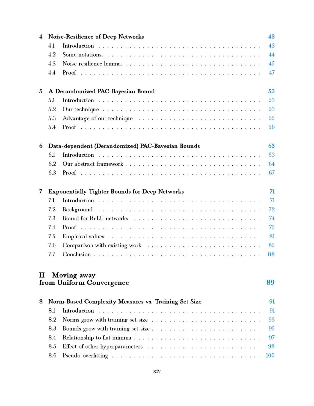 在接下来的几章中,我们将推导一些基本的结果,这些结果将帮助我们最终在第7章中推导出深层网络的PAC-Bayesian边界: (a) PAC-Bayesian技术通常会给我们一个随机模型的边界,其中权重是随机变量。然而,深层网络是确定性模型。为了将PAC-Bayesian界限转化为确定性网络,我们必须正式限定深度网络对参数扰动的弹性程度。在第四章中,我们对深度网络的噪声恢复特性进行了广泛的分析。(b) 在第5章中,我们将推导出一种新的、通用的PACBayesian边界去随机化技术。(c) 通常基于规范的复杂性概念对训练数据是不可知的。在第6章中,我们将提供一个使用上述去随机化技术的方法,来推导包含数据依赖的复杂度概念的边界。