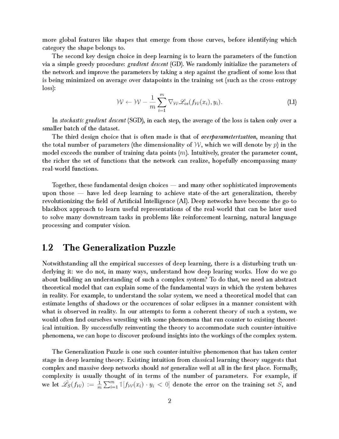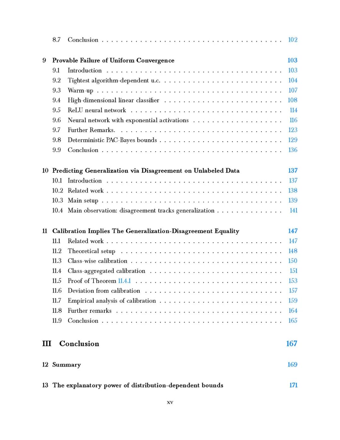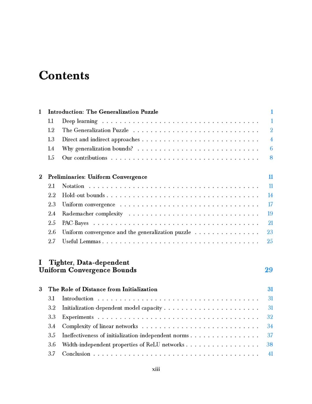在这篇论文的第一部分,我们将讨论在深度网络泛化界的多个发现。如前所述,这些结果符合泛化理论的间接框架(第1.3.2节)。这些章节依赖于一致收敛的工具,它本质上是一种学习理论工具,可以根据复杂性量化泛化——我们将在第二章讨论这个问题。详细:在第3章中,我们将提供经验和理论论证,说明复杂性和内隐偏差的度量不能与深度网络的随机初始化无关。
