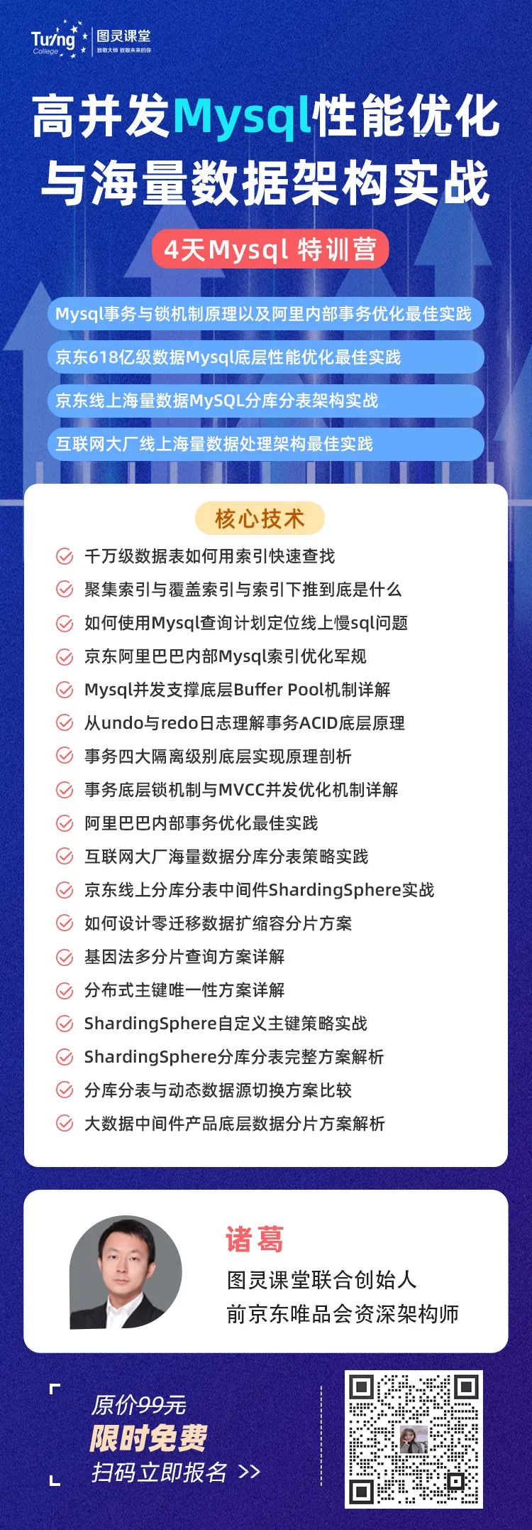 有人说为了进大厂,特地花了一个月左右时间复习MySQL的相关知识,其实没必要。这里推荐一个免费的Mysql实训营给大家——《高并发Mysql性能优化与海量数据架构实战》,四天专攻MySQL,助你向大厂“开炮”,面试不再被难倒。
