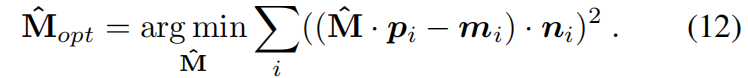 假设pi=(pix,piy,piz,1)T是扫描St中的一个点,mi=(mix,miy,miz,1)T是之前扫描建立的地图中的对应点,ni=(nix,niy,niz,1)T是mi处的单位法向量。建图的目标是找到最优的三维刚体变换: