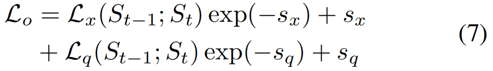 其中xt和qt为相对平移和旋转分量,xt和qt表示它们预测的对应分量。l是欧几里得空间中的距离范数,我们在本文中使用ℓ2-范数。由于平移分量和旋转姿态分量在尺度和单位上的差异,之前的工作[17,34]给旋转损失提供了一个权重正则化器λ来联合学习6自由度姿态。然而,当使用来自不同场景的新数据时,需要调整超参数λ。为了避免这个问题,我们使用两个可学习的参数sx和sq来平衡损失项[16]中的平移分量和旋转分量之间的尺度。