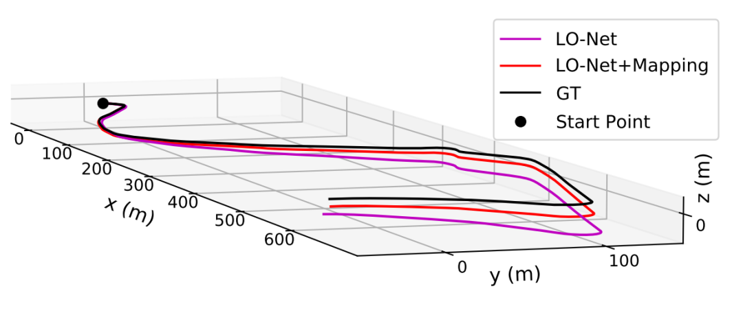图5. 我们方法在KITTI Seq 10上生成的三维轨迹图。该建图模块有效地减少了在LO-Net中产生的垂直漂移