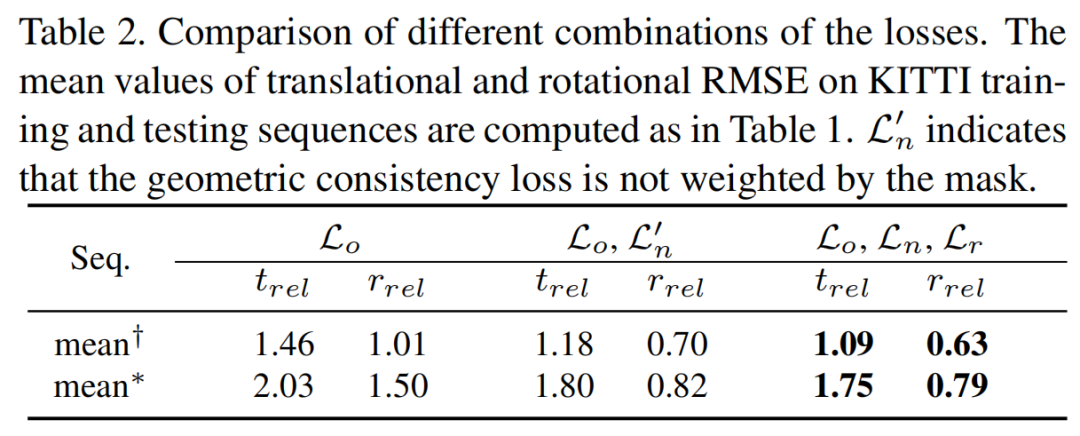 消融实验:为了研究在第3节中提出的不同损耗分量的重要性,我们通过训练和测试使用不同损耗组合的LO-Net,对KITTI数据集进行了消融研究。如表2所示,该网络在进行完全损耗训练时,该网络的平均性能最好。