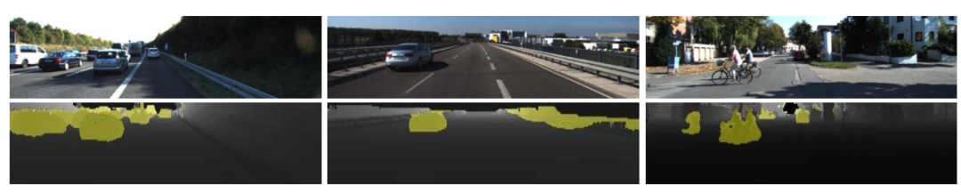 图9. 在数据矩阵及其相应的RGB图像的范围通道上的掩模的样本可视化。黄色像素表示周围环境中不确定的点,如移动汽车、自行车等点。这些图像被裁剪和重塑,以更好地可视化。