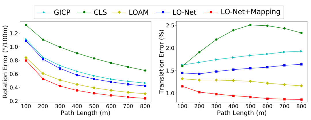 图7. 对KITTI序列00-10的评估结果。我们展示了平移和旋转相对于路径长度间隔的平均误差。我们的LO-Net+建图在所有评估方法中取得了最好的性能。