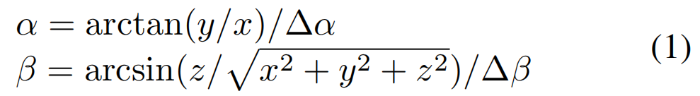 如图2所示,具有环形结构的三维激光雷达点云通常用笛卡尔坐标表示。为了将原始的稀疏和不规则的点云转换为可以输入网络的结构化表示,我们通过圆柱投影[6]将激光雷达数据编码为点云矩阵。给定激光雷达坐标系(X、Y、Z)中的一个三维点p=(x、y、z),投影函数为
