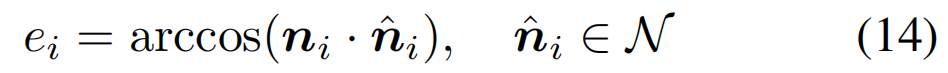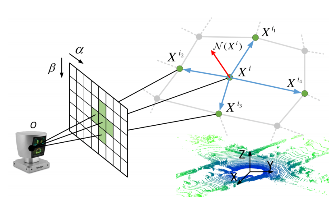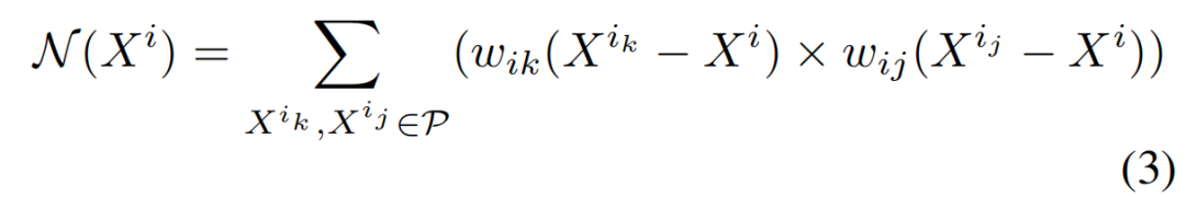 其中式中(Xik−Xi)是一个三维向量,wik是Xik相对于Xi的权值,[·]T是一个k×3向量。||N(Xi)||2 = 1.我们将wik 设为e−0.2|r(Xik)−r(Xi)|),以对与Xi具有相似范围值r的点施加更多的权重,否则施加更小的权重。求解方程(2)的一种常用策略是进行主成分分析(PCA),并将法向量估计转换为由Xi的邻居创建的协方差矩阵的特征向量/特征值的计算。在我们的工作中,这种法向量估计需要被嵌入到网络中。协方差矩阵及其特征向量的计算使得训练和估计效率低下。因此,我们通过计算Xi的四个邻居上的加权交叉积来简化法向量估计。然后我们使用移动平均滤波器[20]来平滑法向量。这可以表述为