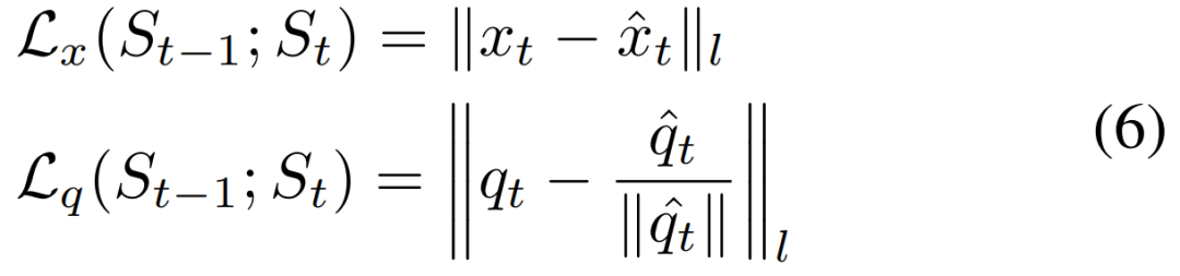 同时学习位置和方向方向。在我们的方法中,我们选择四元数来表示旋转,因为它是一个连续的和平滑的旋转表示。四元数q和−q映射到相同的旋转上,所以我们需要将它们约束在一个单位半球上。我们使用Lx(St−1;St)和Lq(St−1;St)来分别演示如何学习相对平移和旋转分量。