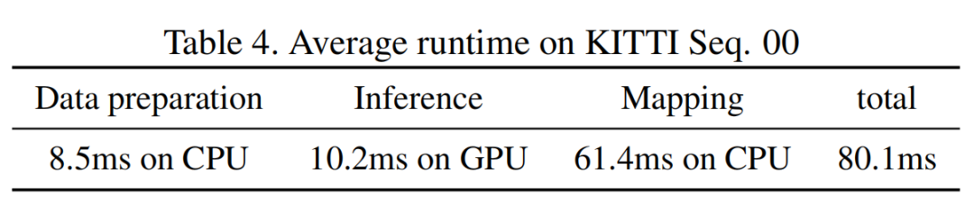 激光雷达扫描点云是连续输入的,及时处理这些数据对于机器人应用是至关重要的。请注意,与基于图像的计算机视觉应用不同,常用的激光雷达传感器,如KITTI和Ford数据集中使用的velodyne HDL-64以10Hz的速度旋转,即每次扫描0.1秒。因此,这里的实时性能意味着每个扫描数据的处理时间都小于0.1s。我们选择了NVIDIA 1080 Ti GPU和英特尔酷睿i7 3.4 GHz 4核CPU。在测试时,LO-Net的数据批大小设置为1。表4显示了Seq上的平均运行时间。00年的KITTI数据集。我们的框架的平均处理时间每次扫描约为80.1 ms。合理地说,我们的大部分运行时间都花在了建图过程上。与大多数传统的激光雷达里程计估计算法相比,包括3.2节中评估的方法,我们基于地图的优化是闪电般的快速,因为我们使用了新的新表示。我们的方法通过在GPU平台上的直接pipeline现实时性能。对于性能较低的平台,我们还可以通过LO-Net的并行性和建图来加快处理速度。目前,我们的框架的一些部分运行在CPU上,我们可以在GPU上实现它们,以进一步提高速度。