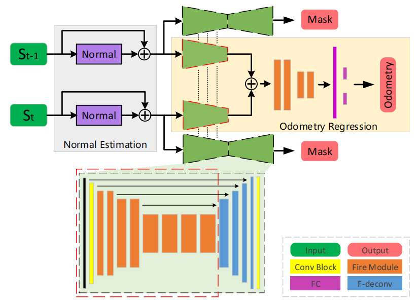 我们提出了一种新的scan-to-scan的激光雷达里程计估计网络,该网络同时学习估计动态区域的法线和掩模