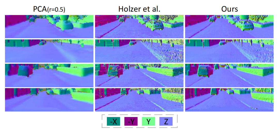 由于KITTI和Ford数据集不能为法向量评估提供基准,我们比较了用PCA和Holzer[14]的方法计算出来的法向量结果。主成分分析通过从其周围的相邻点拟合一个最小二乘平面来估计某一点上的表面法线。在我们的实验中,我们选择了半径r=0.5m和r=1.0m作为尺度因子,以确定一个点的最近邻集合。如图8所示,我们估计的法线可以提取出平滑的场景布局和清晰的边缘结构。为了定量比较,对r=为0.5m的PCA计算出的法线进行插值并作为地面真实值。然后利用点余弦距离计算预测的法态值与地面真实值之间的误差。