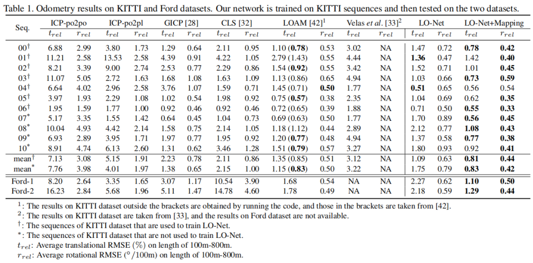 表1. KITTI和Ford数据集的odometry结果。我们的网络在KITTI序列上进行训练,然后在两个数据集上进行测试。
