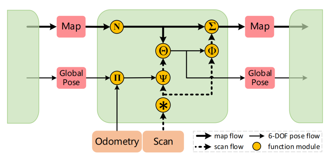 图3. 建图模块连续计算了激光雷达在世界坐标系中的低漂移运动,并利用激光雷达数据构建了一个遍历环境的三维地图。文中解释了函数符号的具体含义