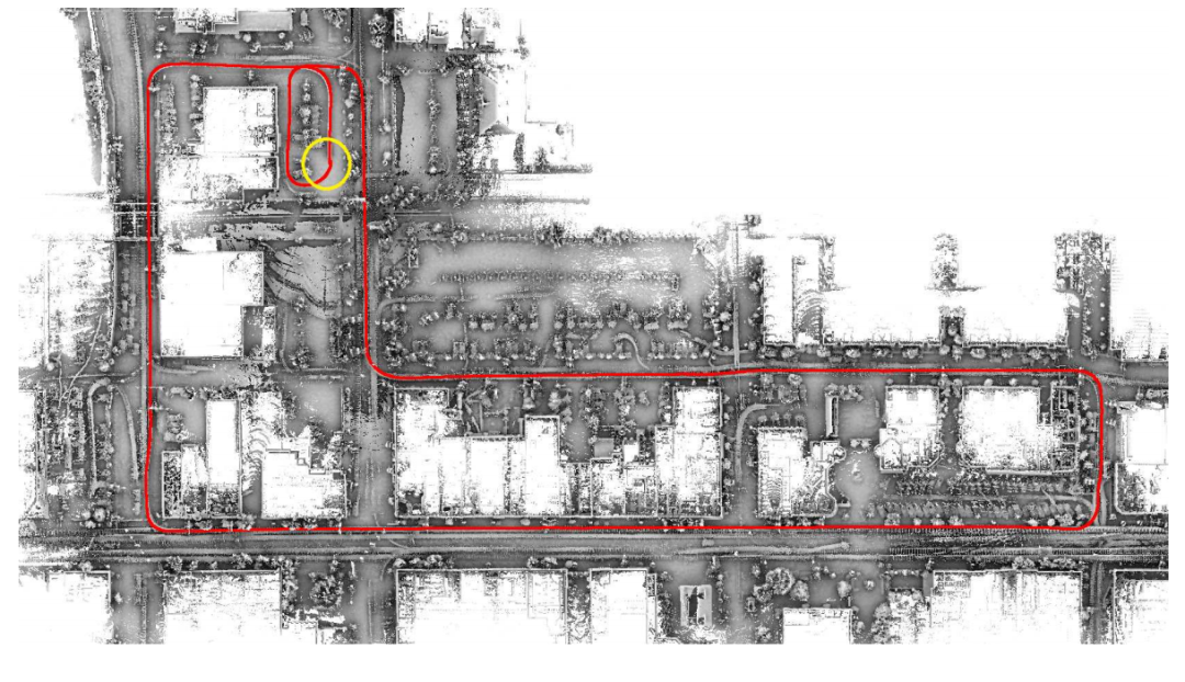 图4. 轨迹(红色)和在Ford数据集1上建立的LONet+地图。我们重建的轨迹(不强制环路闭合)有小的漂移,并准确地形成闭环(黄色圆圈)。