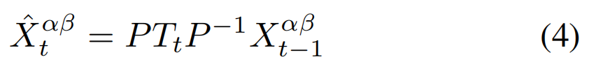 由于扫描序列的时间空间几何一致性,一个点云矩阵中的点在另一个点云矩阵中应该有对应的点。设Xt-1αβ和Xtαβ分别为连续数据矩阵St−1和St的空间对应的点元素。二者的变换关系为: