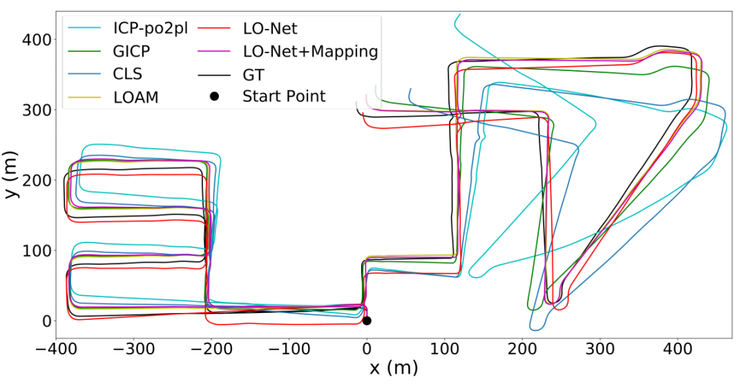 图6. KITTI Seq 08的轨迹图与地面真值。我们的LO-Net+建图产生了最准确的轨迹