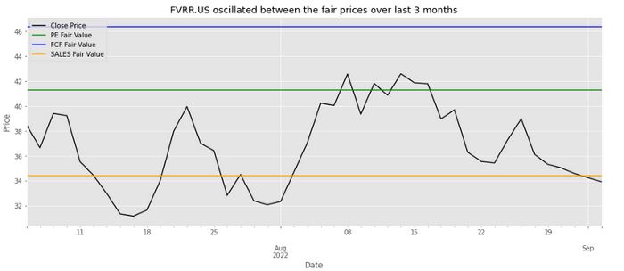 最终得到了一个易于使用的小脚本,可以使用来自 EOD 的 API 的数据从根本上评估想要的任何股票。从目前的分析中,可以看到 FVRR 的当前价格可能被略微低估了。此外,可以观察到三个模型价格对应的股票价格和绘图线,这样更容易直观地了解股票当前的位置。