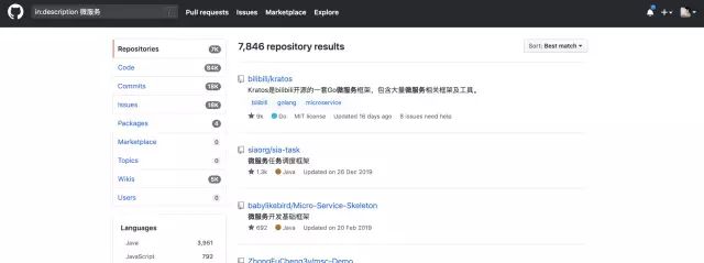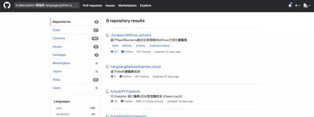 假设我们现在要学习微服务的项目,我们搜索项目描述(description)里面包含微服务的项目:in:description 微服务 language:python
