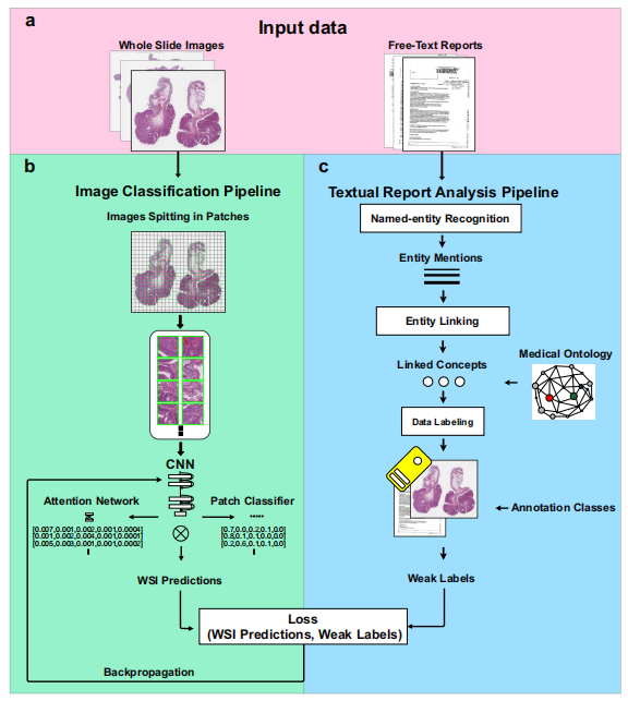 近日,一组来自瑞士、意大利、波兰、荷兰等国家的研究团队在杂志npj Digital Medicine上发表了一篇题为“Unleashing the potential of digital pathology data by training computer-aided diagnosis models without human annotations”的文章,这项文章提出并评估了一种方法,以消除在数字病理学中培训计算机辅助诊断工具的手动注释的需要。该方法包括两个部分:从诊断报告中自动提取语义上有意义的概念,并将其用作弱标记,以训练卷积神经网络(CNN)进行组织病理学诊断。该方法在两家医院提供的3769张临床图像和报告上进行了训练,并在来自私人和公共可用数据集的11000多张图像上进行了测试。将使用自动生成标签训练的CNN与使用手动标签训练的相同架构进行比较。结果表明,该工具仅基于现有临床数据,无需手动注释,即可达到可靠性能。