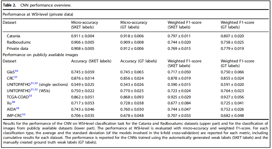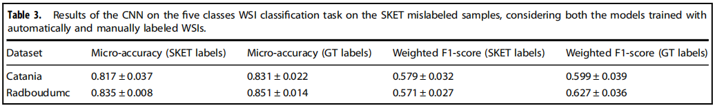 为了验证这一结果,分别使用自动和手动弱标记训练的模型的CNN在被SKET错误标记的CNN的WSI上进行评估。SKET错误标记了来自Catania的25%的WSI(1704中的421个)和来自Radboudumc的15%的WSIs(2065中的306个)。结果显示,使用自动和手动生成的弱标签训练的CNN的差异无统计学意义。