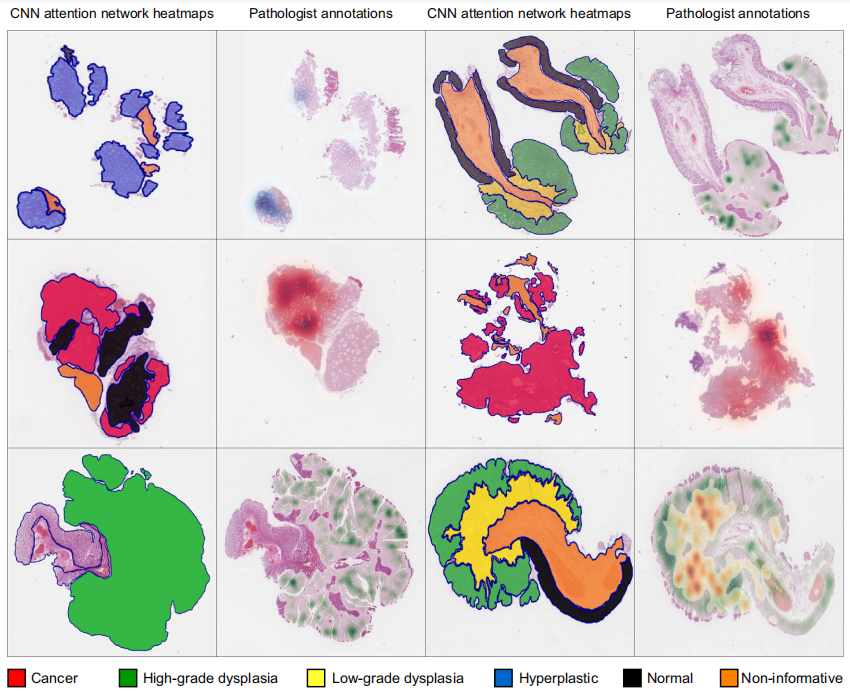 注意网络对每个类的patch进行加权,以便具有最高注意力值的patch对全局预测贡献更大。在下图中,由网络分配给内部测试分区的权重被可视化为热图。热图分析表明,每个类别的注意模型最集中的区域包括病理学家在像素注释中用相应类别注释的补丁。因此,注意网络更加重视包括相关patch在内的区域,导致CNN预测正确的全局诊断。