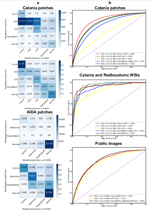 图a显示了CNN在patch-level分类中的混淆矩阵和ROC曲线。在Catania数据上,该模型非常有效地将癌症和正常分类(超过一半的样本分类良好),而对于其他类别,尤其是高级发育不良类别,该模型表现出较低的性能。在AIDA数据上,该模型也以良好的性能分类了大多数类。