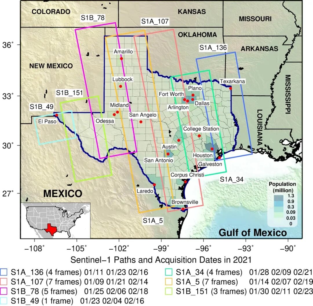 图1:美国德州人口分布及Sentinel-1影像足迹