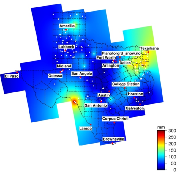 研究使用的数据包括土壤湿度、地表高程、SAR幅度影像、降水、温度、地面扰动和地面覆盖,同时为了探索潜在的“热岛效应”,还补充了人口数据(图2)。研究结果显示模型估算积雪深度与气象站点的观测结果高度吻合,德克萨斯州在此次事件中存在四个强地面扰动区,包括北部的东Panhandle区、东北部的Ark-Tex、西南部Middle Rio Grande和东南部的休斯顿地区,积雪深度超过30毫米(图3)的区域占89%,而降水量、地表高程和地面扰动这三个特征在模型估算中最为重要。