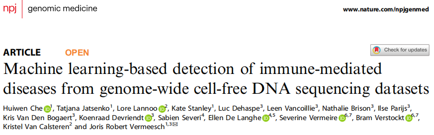 低深度全基因组cfDNA测序(sWGS)数据的增长量允许使用机器学习方法探索疾病相关cfDNA特征。通过应用GIPXplore,已经证明了癌症患者血浆cfDNA图谱中存在癌症特异性模式。近日,一组来自比利时的研究团队在杂志npj Genomic Medicine上发表了一篇题为“Machine learning-based detection of immune-mediated diseases from genome-wide cell-free DNA sequencing datasets”的文章,在文章中,研究团队应用GIPXplore研究自身免疫相关疾病的cfDNA特征。通过对孕妇和非孕妇个体的独立队列中的80000多个cfDNA图谱进行研究,研究团队发现了AID和IBD相关的全基因组cfDNA特征,可以在怀孕期间和非怀孕患者中检测疾病。这项研究表明,cfDNA的sWGS可以在怀孕早期识别患有免疫介导疾病的女性,对检测、诊断和监测高危人群具有潜在的实用价值。此方法可以很容易地与常规NIPS工作流程集成,如大规模前瞻性试验成功可以广泛实施,以更好地进行产前管理。